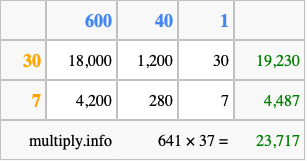 That's all there is to it! As you can see from the box above, the answer to 641 times 37 using the box method is 23,717.