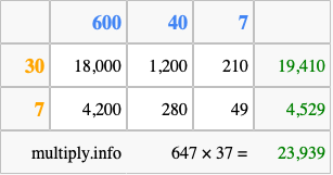 That's all there is to it! As you can see from the box above, the answer to 647 times 37 using the box method is 23,939.