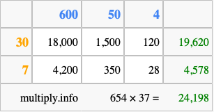 That's all there is to it! As you can see from the box above, the answer to 654 times 37 using the box method is 24,198.