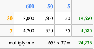 Finally, we add up all the sums we found in step 3 to get our final answer to 655 times 37.