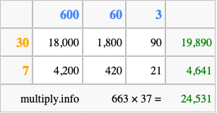 That's all there is to it! As you can see from the box above, the answer to 663 times 37 using the box method is 24,531.