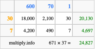 Finally, we add up all the sums we found in step 3 to get our final answer to 671 times 37.