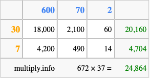 Finally, we add up all the sums we found in step 3 to get our final answer to 672 times 37.