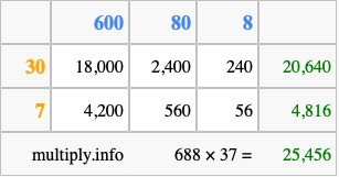 Finally, we add up all the sums we found in step 3 to get our final answer to 688 times 37.
