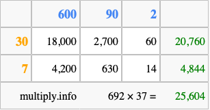 Finally, we add up all the sums we found in step 3 to get our final answer to 692 times 37.