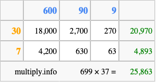 That's all there is to it! As you can see from the box above, the answer to 699 times 37 using the box method is 25,863.
