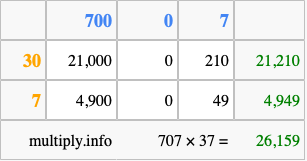 That's all there is to it! As you can see from the box above, the answer to 707 times 37 using the box method is 26,159.