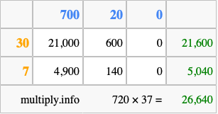 That's all there is to it! As you can see from the box above, the answer to 720 times 37 using the box method is 26,640.