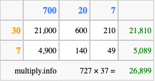 That's all there is to it! As you can see from the box above, the answer to 727 times 37 using the box method is 26,899.