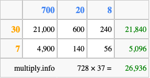 Finally, we add up all the sums we found in step 3 to get our final answer to 728 times 37.
