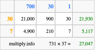 Below is an illustration showing you how to calculate 731 times 37 using the box method, using the instructions above.