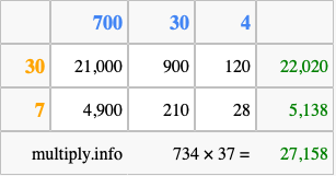 Finally, we add up all the sums we found in step 3 to get our final answer to 734 times 37.