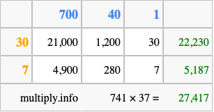 Finally, we add up all the sums we found in step 3 to get our final answer to 741 times 37.
