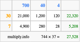 That's all there is to it! As you can see from the box above, the answer to 744 times 37 using the box method is 27,528.