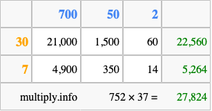 Finally, we add up all the sums we found in step 3 to get our final answer to 752 times 37.