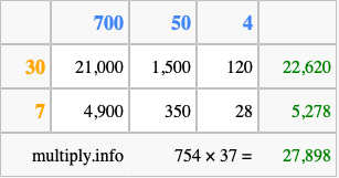 Finally, we add up all the sums we found in step 3 to get our final answer to 754 times 37.