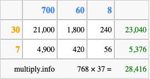 Finally, we add up all the sums we found in step 3 to get our final answer to 768 times 37.