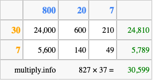 Below is an illustration showing you how to calculate 827 times 37 using the box method, using the instructions above.