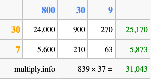 Below is an illustration showing you how to calculate 839 times 37 using the box method, using the instructions above.