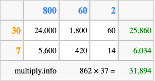 Finally, we add up all the sums we found in step 3 to get our final answer to 862 times 37.