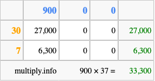 That's all there is to it! As you can see from the box above, the answer to 900 times 37 using the box method is 33,300.