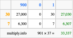 That's all there is to it! As you can see from the box above, the answer to 901 times 37 using the box method is 33,337.