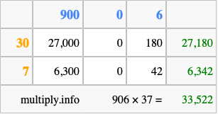 That's all there is to it! As you can see from the box above, the answer to 906 times 37 using the box method is 33,522.