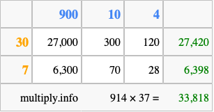 Below is an illustration showing you how to calculate 914 times 37 using the box method, using the instructions above.