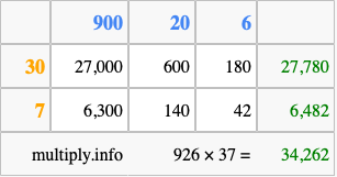 That's all there is to it! As you can see from the box above, the answer to 926 times 37 using the box method is 34,262.