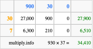 That's all there is to it! As you can see from the box above, the answer to 930 times 37 using the box method is 34,410.