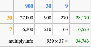 Below is an illustration showing you how to calculate 939 times 37 using the box method, using the instructions above.