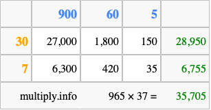 Finally, we add up all the sums we found in step 3 to get our final answer to 965 times 37.