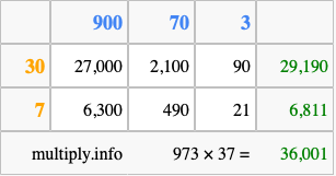 Below is an illustration showing you how to calculate 973 times 37 using the box method, using the instructions above.