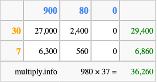Finally, we add up all the sums we found in step 3 to get our final answer to 980 times 37.