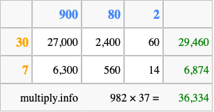 That's all there is to it! As you can see from the box above, the answer to 982 times 37 using the box method is 36,334.