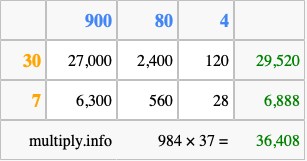 Finally, we add up all the sums we found in step 3 to get our final answer to 984 times 37.