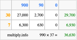 Below is an illustration showing you how to calculate 990 times 37 using the box method, using the instructions above.