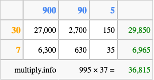 Below is an illustration showing you how to calculate 995 times 37 using the box method, using the instructions above.