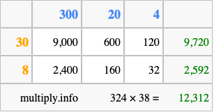 Finally, we add up all the sums we found in step 3 to get our final answer to 324 times 38.