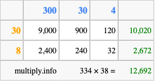 Finally, we add up all the sums we found in step 3 to get our final answer to 334 times 38.