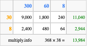 That's all there is to it! As you can see from the box above, the answer to 368 times 38 using the box method is 13,984.