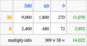 That's all there is to it! As you can see from the box above, the answer to 369 times 38 using the box method is 14,022.