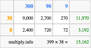 Below is an illustration showing you how to calculate 399 times 38 using the box method, using the instructions above.