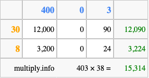 That's all there is to it! As you can see from the box above, the answer to 403 times 38 using the box method is 15,314.