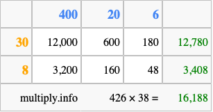 Finally, we add up all the sums we found in step 3 to get our final answer to 426 times 38.