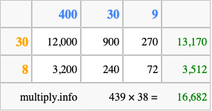 Below is an illustration showing you how to calculate 439 times 38 using the box method, using the instructions above.