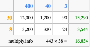 Finally, we add up all the sums we found in step 3 to get our final answer to 443 times 38.