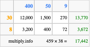 Finally, we add up all the sums we found in step 3 to get our final answer to 459 times 38.