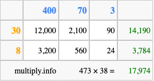 That's all there is to it! As you can see from the box above, the answer to 473 times 38 using the box method is 17,974.