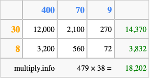 That's all there is to it! As you can see from the box above, the answer to 479 times 38 using the box method is 18,202.